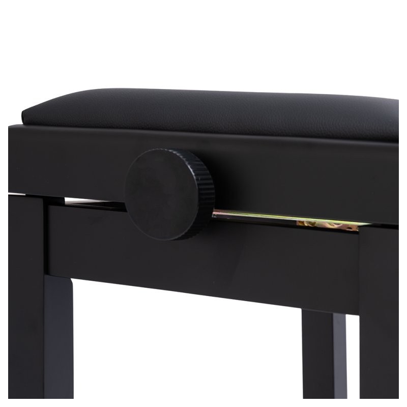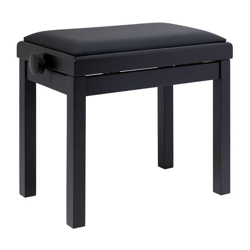 Elegancka ławka do pianina w matowym czarnym wykończeniu to połączenie solidnej konstrukcji i komfortu gry. Wyposażona w regulację wysokości za pomocą bocznych pokręteł oraz ognioodporne siedzisko z czarnego winylu, gwarantuje wygodę i bezpieczeństwo użytkowania. To praktyczny wybór zarówno do domu, jak i do sali koncertowej czy studia.