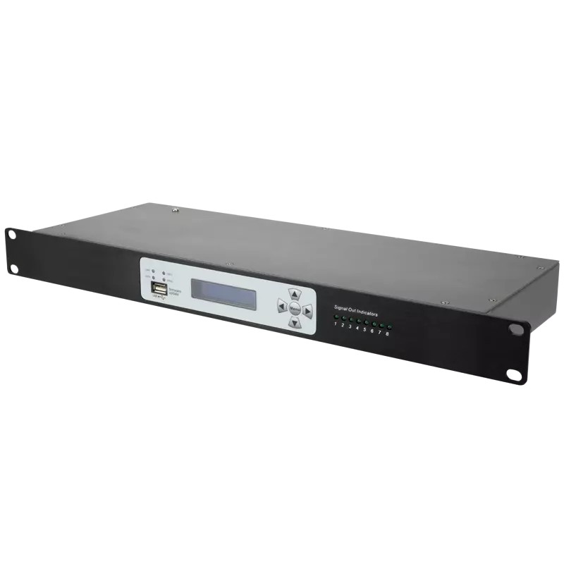 BRAMKA ARTNET/ DMX 8x512 ch to niezawodny, zaawansowany i wszechstronne urządzenie z ośmio portową bramką ArtNet, do DMX 8x512. Wyposażony w funkcję splittera DMX oraz hub-a Art-Net, umożliwiając tworzenie oraz konfigurowanie sieci DMX, na potrzeby dużych instalacji oświetleniowych. W urządzeniu o wielkości 1U, zastosowano 8 izolowanych galwanicznie wyjść, 2x DMX IN, Ethernet (RJ45) IN/THRU, USB Port, wyświetlacz LCD z intuicyjnym menu, jasne diody led sygnalizującą status sygnału wyjściowego.